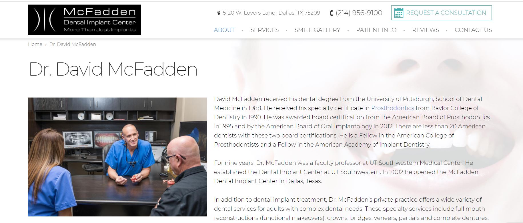 The header features a picture of the center’s interior and has options for more information like what to consider before opting for implants. It also contains a testimonial section that visitors can look at. There’s also a video that you can access by clicking on the picture of Dr. McFadden. If you scroll down more, you’ll see brief information about Dr. McFadden. You can click on the options here to see a more detailed profile of him. The website also displays his rating based on patient reviews which you can access by clicking on the provided option.