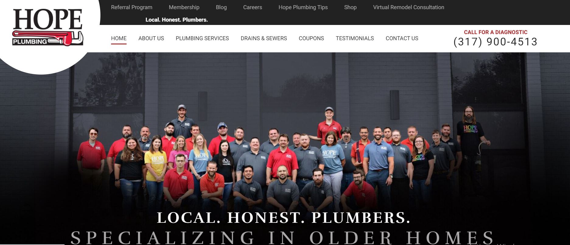 Hope Plumbing’s website is well-designed, with all the necessary elements to attract consumers and convert leads. “Local, honest plumbers specializing in older homes,” reads the hero message, which is spot on. It’s brief, yet it packs a punch with enough information to pique the interest of the intended audience.